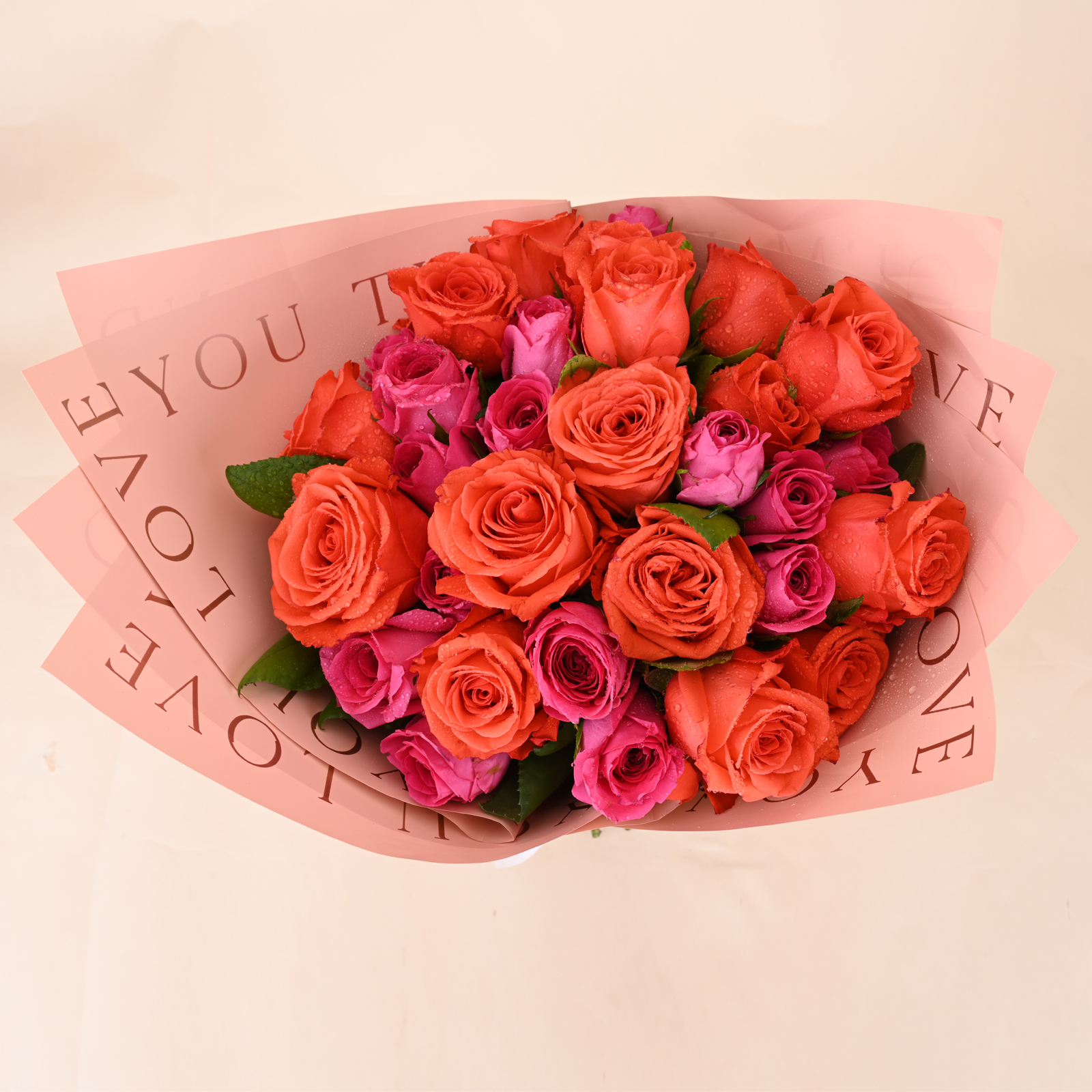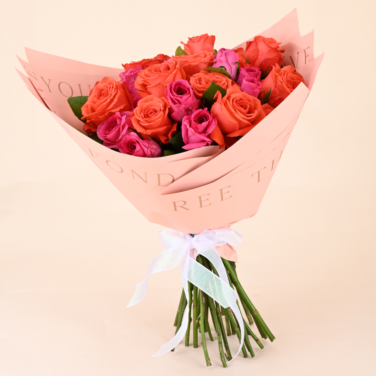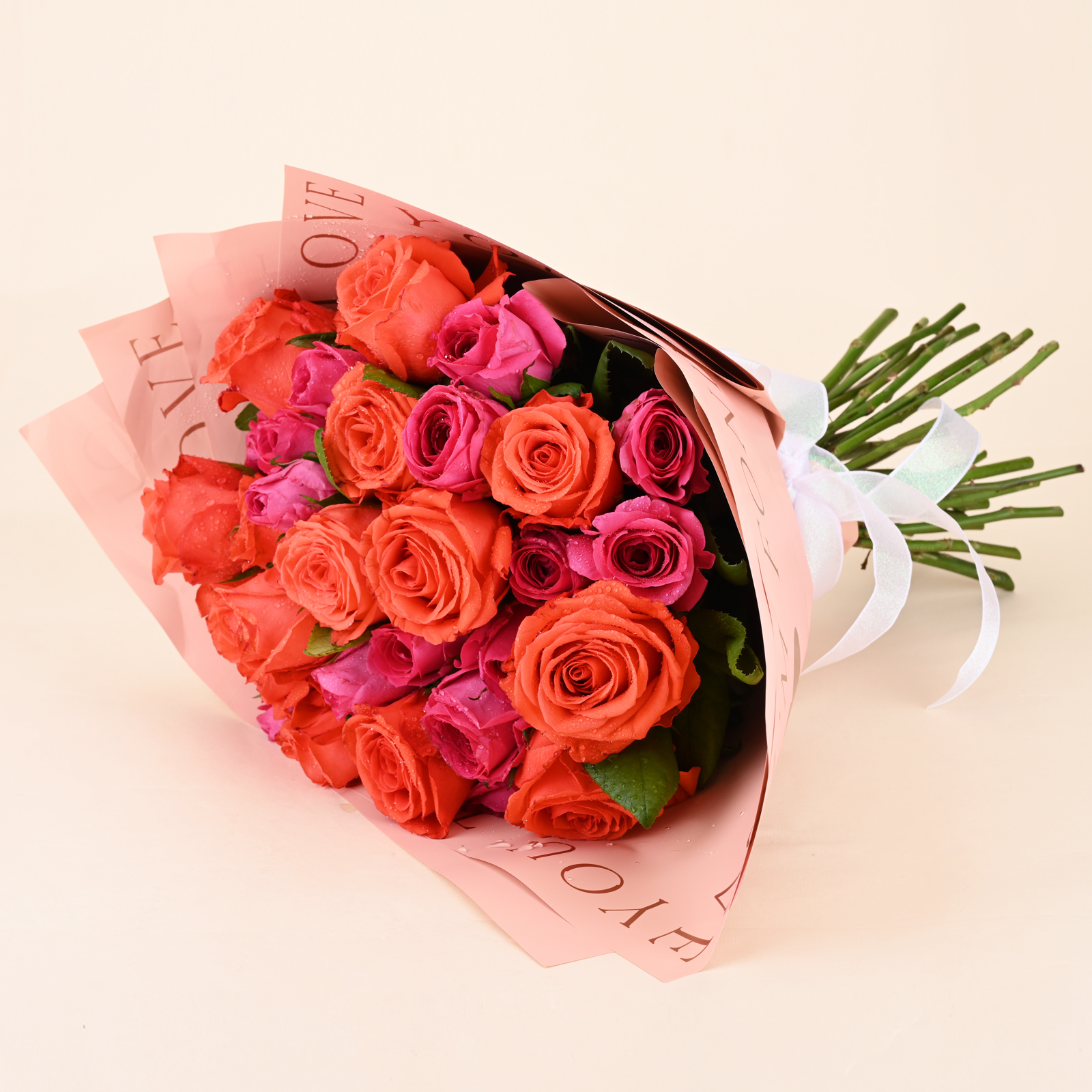 Coral Pink Rose Symphony Bouquet brings together bold coral orange roses and rich hot pink roses for a vibrant, premium look. The colour contrast feels energetic and romantic at the same time, with full blooms that look fresh, bright, and beautifully arranged from every angle.