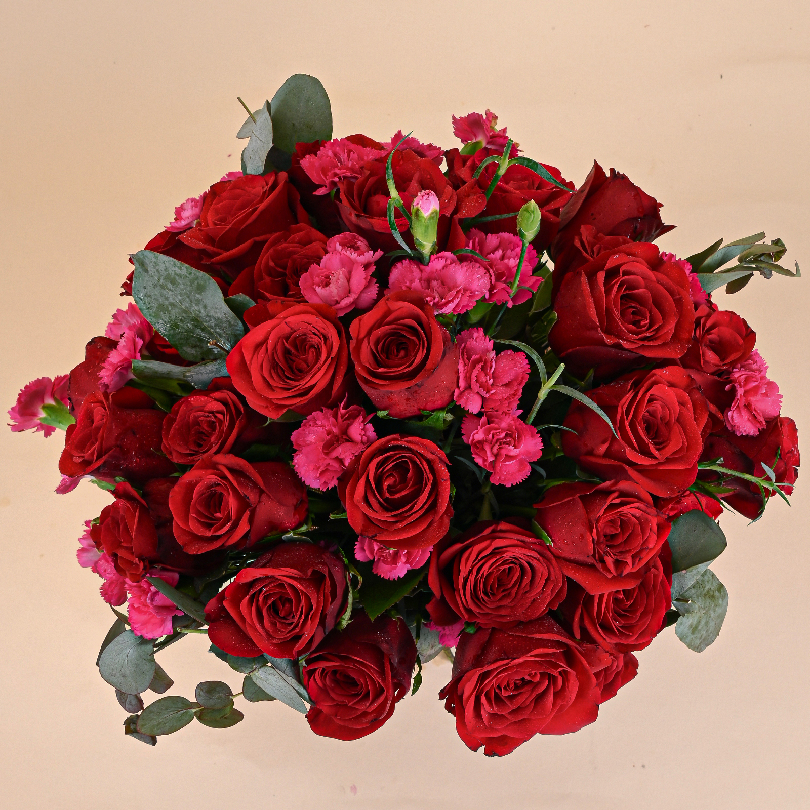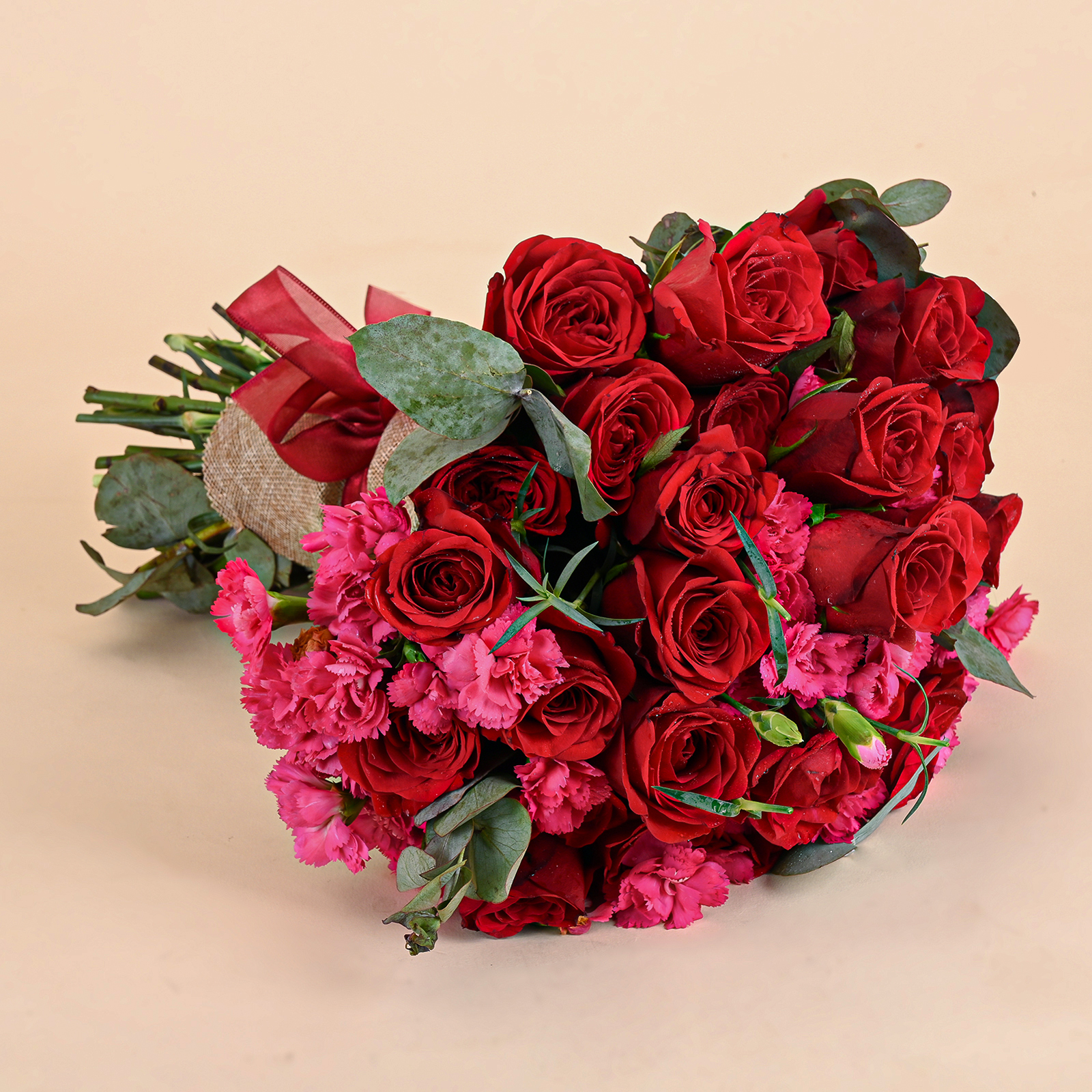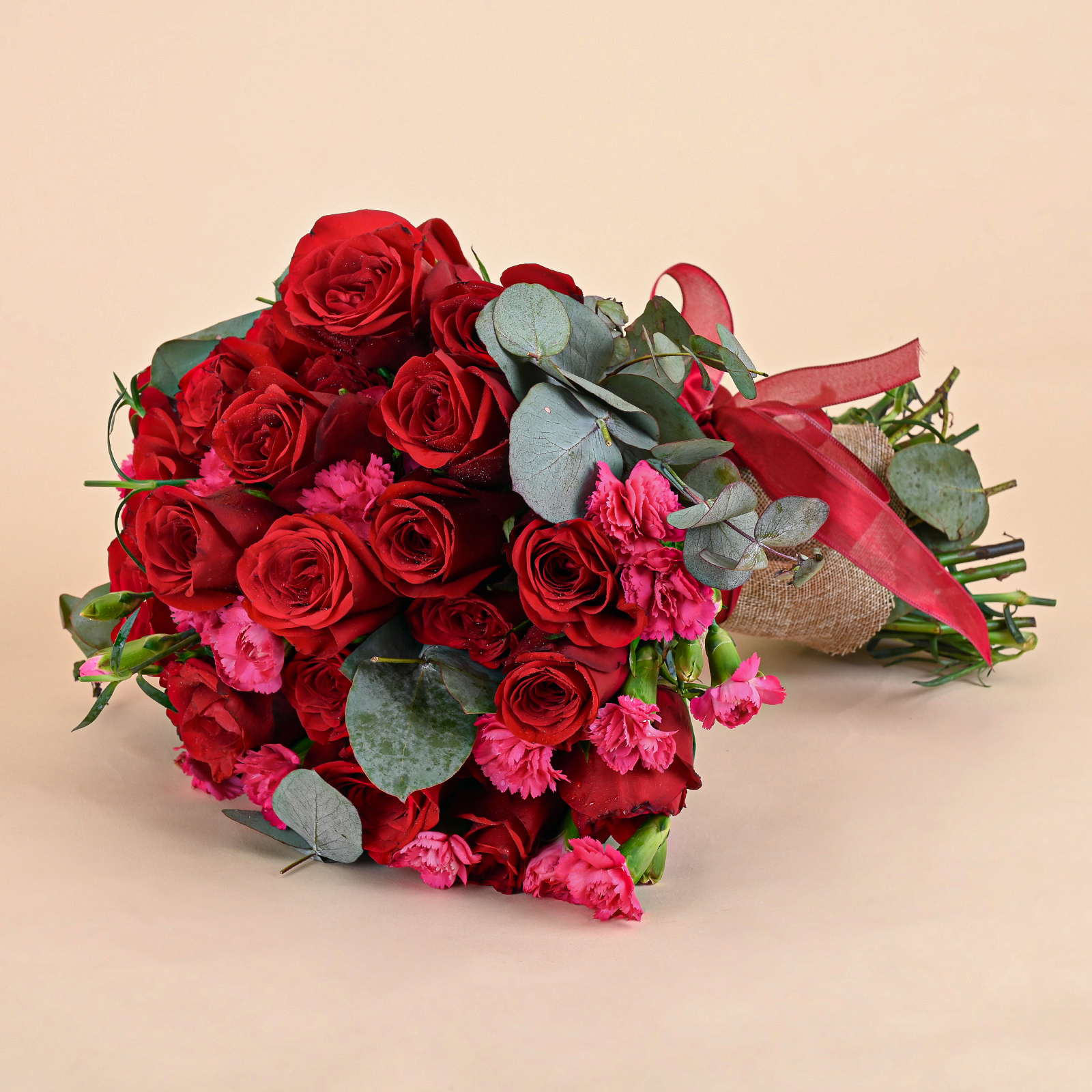 Ruby Pink Romance is a classic red rose bouquet featuring velvety red roses, delicate pink carnation accents, and fresh eucalyptus foliage. The deep red roses create a timeless romantic look, while the soft pink blooms add texture, warmth, and a gentle contrast that makes the bouquet feel both bold and elegant.