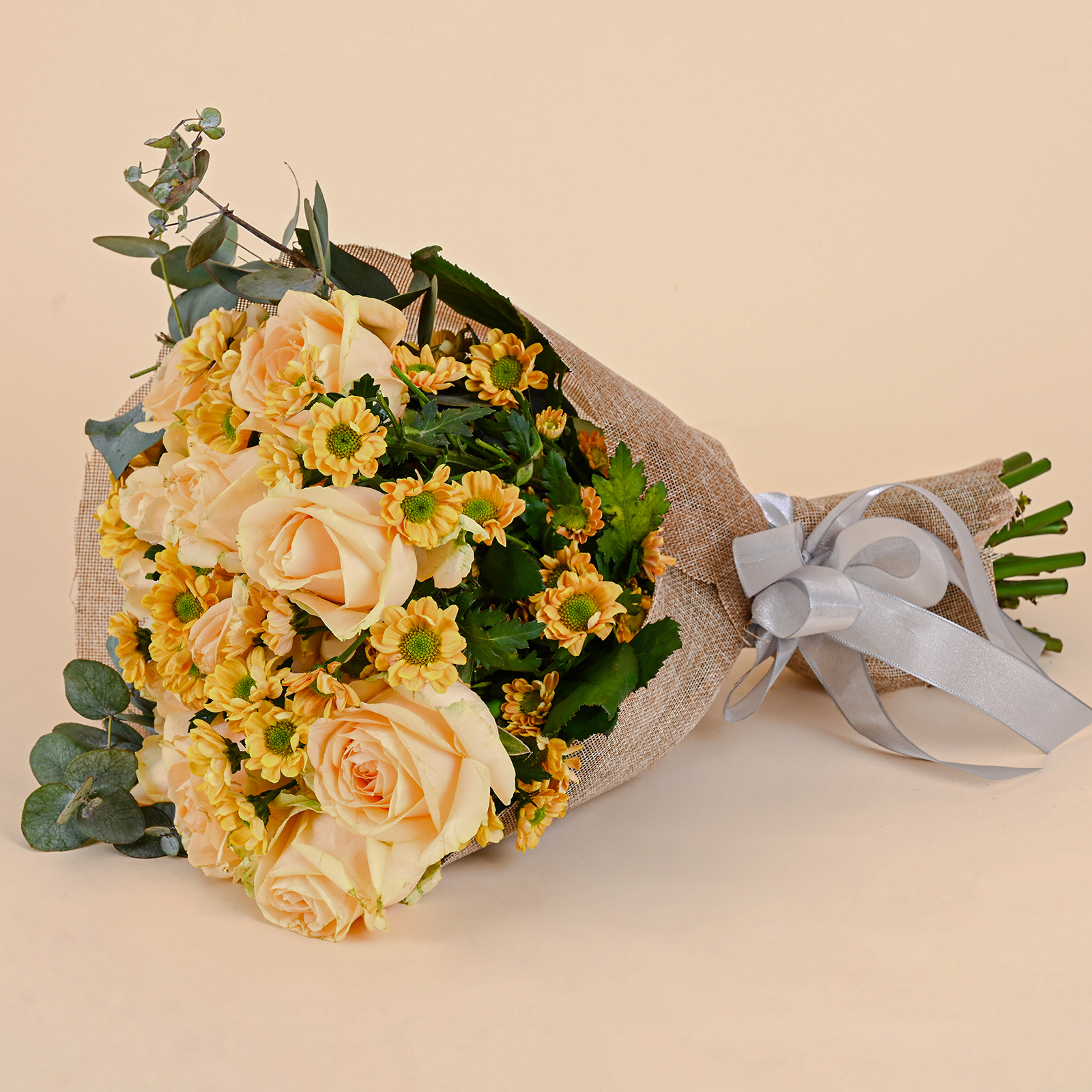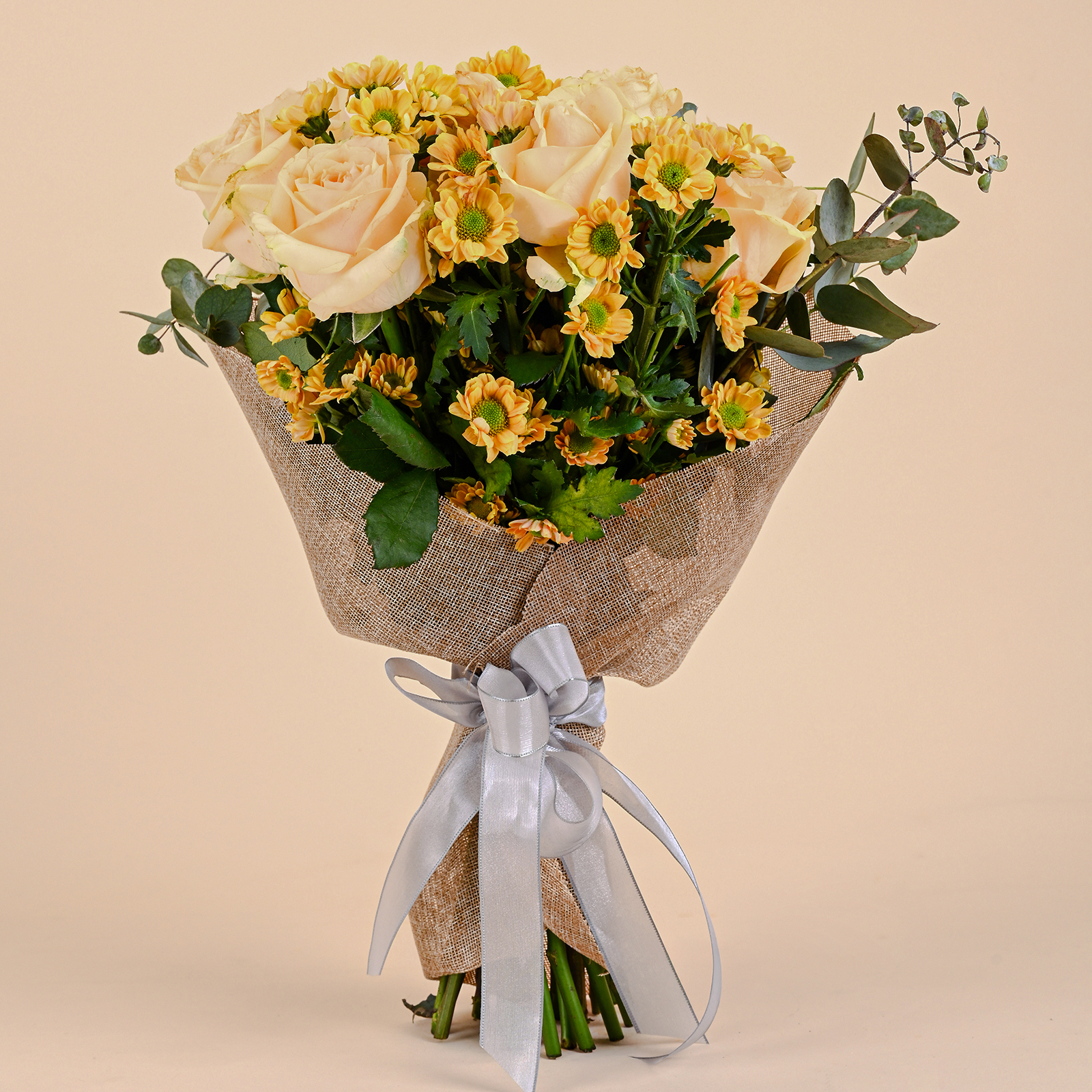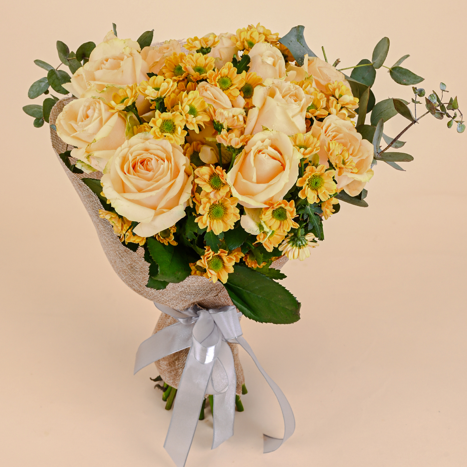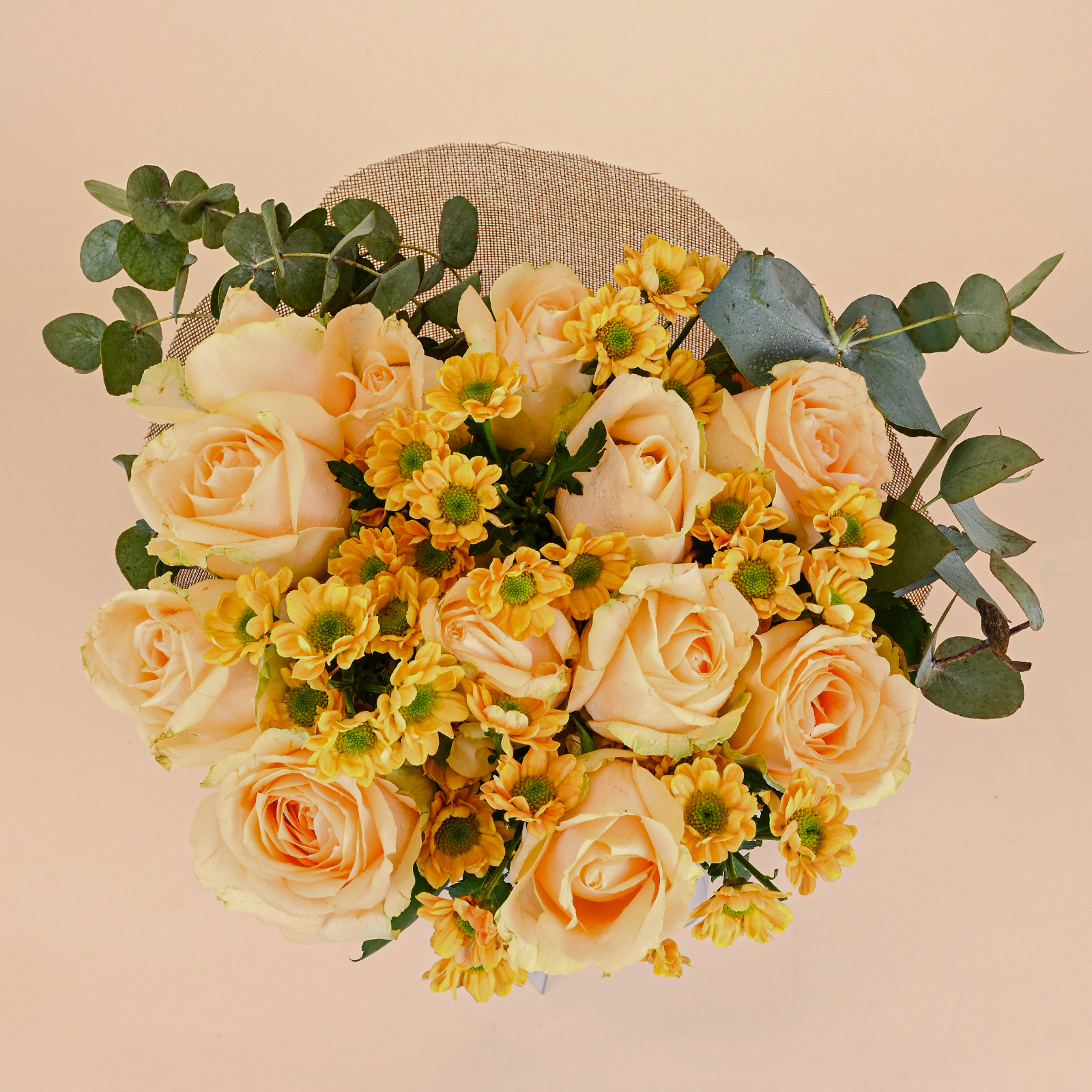 Apricot Morning Bloom is a fresh apricot-peach rose bouquet designed to bring warmth, joy, and elegance to any occasion. Featuring soft apricot-peach roses, cheerful yellow daisy-style blooms, and fresh eucalyptus, this beautifully balanced flower arrangement feels bright, uplifting, and gently romantic.